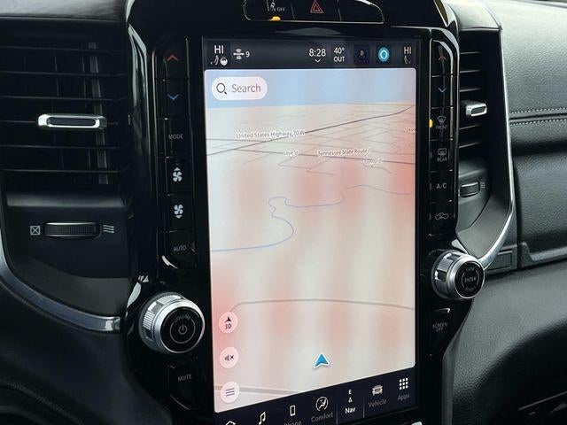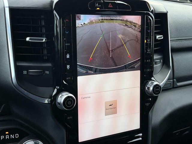 The interior of this Ram 1500 Laramie is equally impressive, with black leather-trimmed bucket seats, a power-adjustable driver's seat with memory, and heated front and rear seats for unparalleled comfort. The Uconnect 5 navigation system with a 12-inch display keeps you connected and informed, while the premium audio system with 10 speakers delivers an immersive listening experience.